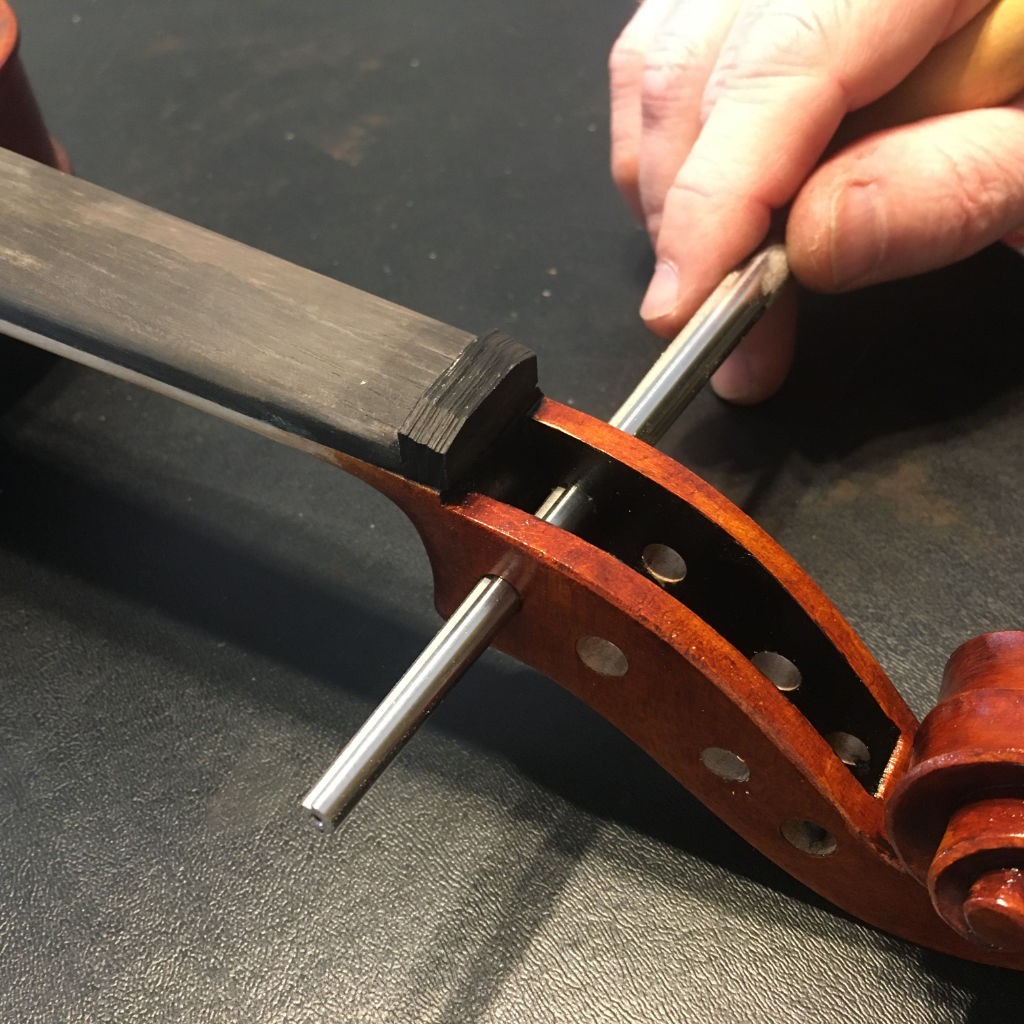 Next, I'll be shaping the nut and filing the grooves for the strings to be seated. Also, the pegs need holes drilled, and the length needs to be brought to size. There is a soundpost that is wedged inside the body under the bridge that I'll need to cut and shape too.