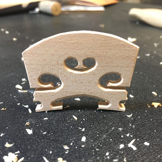 The last step before stringing the violin is the bridge. Much time went into the shaping and sizing of this bridge. The bridge determines much of the sound transfer from the strings to the soundboard, so it is essential to get it right. It also determines the string spacing and height. After carving the bridge to the perfect shape, I laid a piece of sandpaper on the violin top to sand the feet to the top's contour. I was pleased with how the bridge turned out, although I did need to work it a little more after I had the strings on and played it for a while. Oh yeah. Next, I'll take pictures of the final and then record its voice. Stayed tuned!