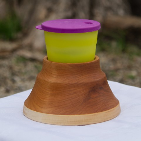 The solution is the cup holders pictured in this blog post. I specifically designed these cup holders to be non-tippable with a non-slip bottom. Now, the cup is stable and looks good. I made the non-slip feet from a sheet of material designed for the purpose. However, because I needed round pads, I sharpened the edge of a 5/8" pipe and punched them out of the sheet, which worked perfectly. To finish the cherry and maple wood, I applied a food-safe walnut oil that protects the wood brings out the color and grain. I enjoy projects where a solution to a problem can also be an esthetic piece of art.